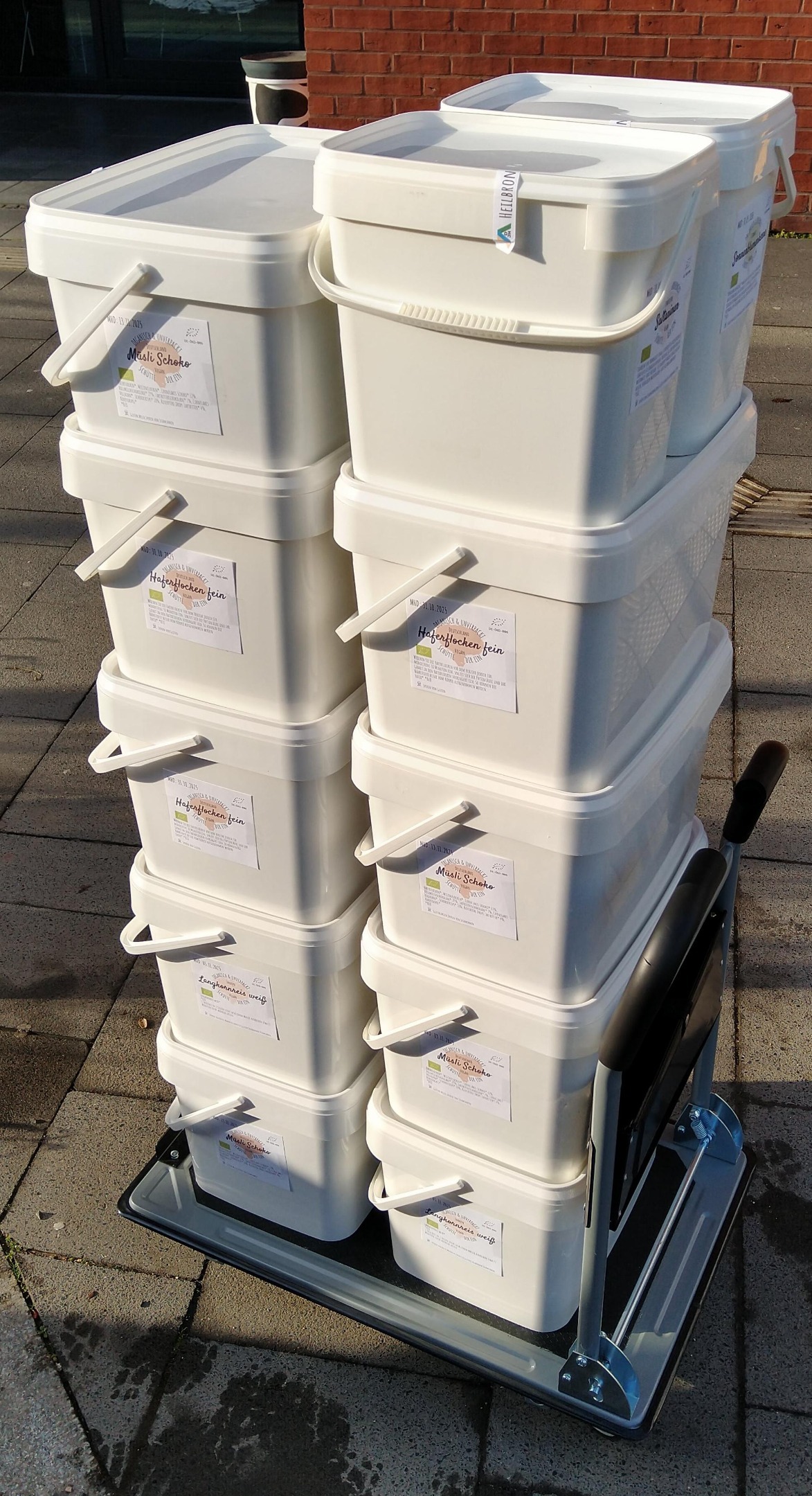 Die Ware liefern wir in lebensmittelechten, hermetisch verschlossenen, Schädling-sicheren Mehrweg-Eimern. Bei der nächsten Lieferung holen wir die leeren Eimer dann wieder ab.
